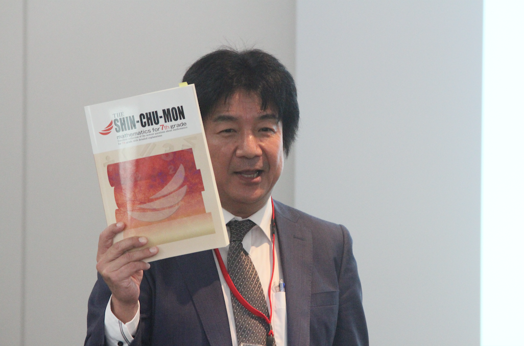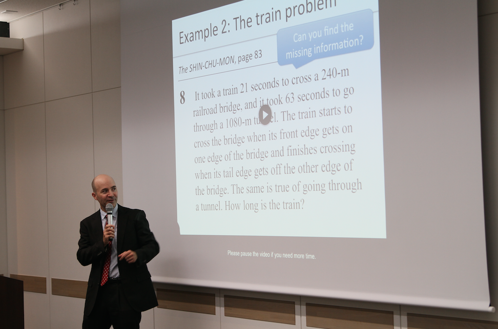 最後にブライアン・ショウ氏が、実際に同問題集のイマージョン版(THE SHIN-CHU-MON)を使った授業のワークショップを行った。ショウ氏は、国内SSHでのMATH IN ENGLISHの講師を務めるなど、英語教育現場における豊富な経験を持つ。授業はアクティブラーニング形式で行われ、参加者も大いに参考になったに違いない。また、ショウ氏は、この問題集は日本語版とリンクしているため、日本語版の学習を終えた高校生が使うのも有効的だと語った。
