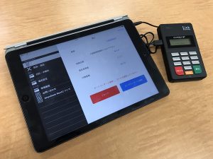 口座登録するには「e海舟」の専用端末とタブレットを接続して、キャッシュカードを読み込ませるだけ