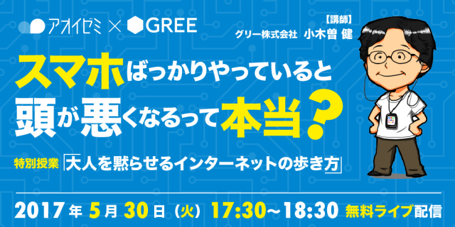 30万人の中高生が利用するスマホ学習塾「アオイゼミ」は、大手インターネット企業のグリーと共同で、5月30日(火)17:30~18:30に、中高生向けの「情報モラル」特別授業として『大人を黙らせるインターネットの歩き方』を無料ライブ配信する。