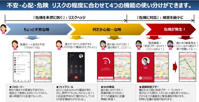 「防犯・リスク回避機能」としては、本人の選択によってGPSによる移動経路を見守る「フォローミー機能」、着信偽装で不審者へけん制する「フェイクコール機能」、登録連絡先へ位置情報つき通知メッセージを即時に発信する「SOS発信緊急機能」、鳴動と同時にSOS発信とGPS追跡で連れ去りなどを抑止し対応する「GPS追跡防犯ブザー機能」がある。これらの機能は不安や危険度によって段階的、選択的に使い分けられるようになっているだけでなく、保護者や塾管理者は、アプリのほか携帯やPCでも通知や連絡を受け取ることが可能だ。