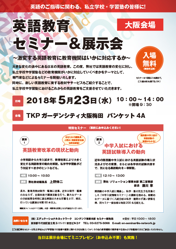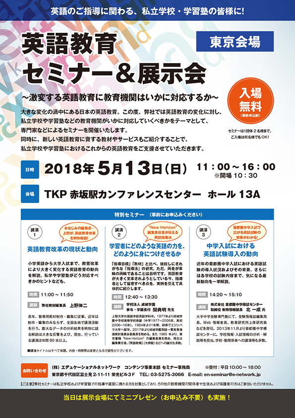 株式会社エデュケーショナルネットワーク(EN社)は、2018年5月13日(日)東京、5月23日(水)大阪で「英語教育セミナー&展示会」を開催する。