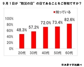 9月1日は、防災の日。日本赤十字社は防災の日に関する独自の意識調査を実施した。「防災の日を知っている」と答えた20代は半数以下の48%。年代が下がるにつれ、防災の日の意識が薄れていっていることが分かった。