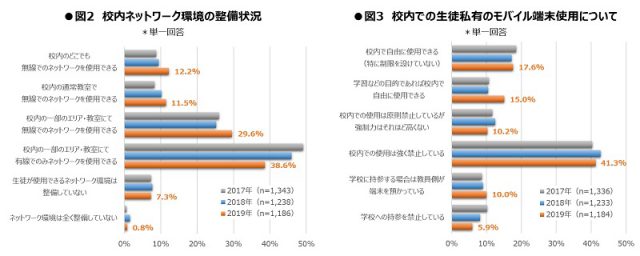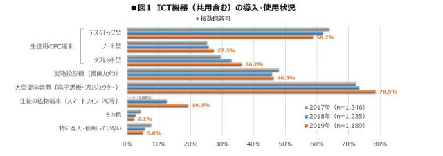 学校側での環境構築とは別の観点でICT機器の利用実態に注目すると、“スマートフォンの教育的利用”について動きが見られる。ICT機器の中で、「生徒の私物端末(スマートフォン・PC等)」を使用していると答えた高等学校は全体の19.3%に上り、昨年から6.8ポイント増となった。〈図1〉