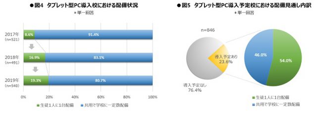 また、導入校に対し、端末の配備状況の内訳を調べたところ、「生徒1人1台配備」と答えた高等学校の割合は合計で19.3%となり、大幅増となった昨年度調査からさらに2.4ポイント増となった。〈図4〉 この傾向は、今後、タブレット型PCの導入予定があるとする高等学校においては更に顕著で、合計54.0%が「生徒1人1台配備」を見込んでいると答えている。〈図5〉