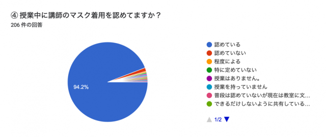 「授業中に講師のマスク着用を認めていますか?」と聞いたところ、94.2%の高い結果に。また、新型コロナウイルス対策として、普段はマスク着用を認めていないが、今は認めているというところを合わせると、ほぼ100%が認めている。