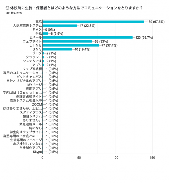 - 「休校の案内はどのような手段で行いますか?」と聞いたところ、Eメールや電話に加えて、LINEや入退室管理システムの存在感が高まっている