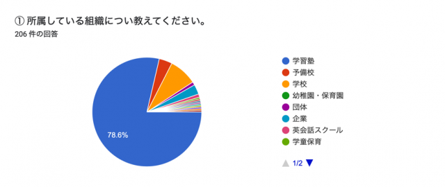 所属している組織について聞いたところ、学習塾が78.6%、学校8.3%、予備校3.9%と続く。