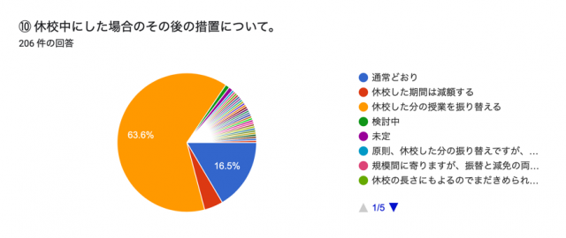 「休校中にした場合のその後の措置について」に聞いたところ、63.6%が「休校した分の授業を振り返る」と回答した。「通常どおり」は16.5%で、4.4%が「休校した期間は減額する」と答えている。
