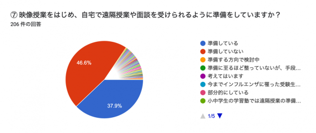 「映像授業をはじめ、自宅で遠隔授業や面談を受けられるように準備をしていますか?」と聞いたところ37.9%が準備をしていると回答し、46.6%は準備をしていないと回答した。