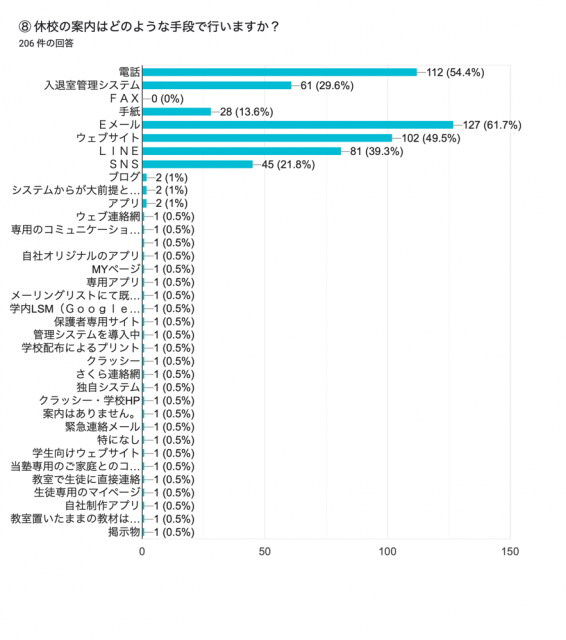 「休校の案内はどのような手段で行いますか?」と聞いたところ、Eメール(61.7%)、電話(54.4%)、ウェブサイト(49.5%)という回答に加えて、LINE(39.3%)、入退室管理システム(29.6%)といったように、保護者への伝達手段が多岐にわたっていることがわかった。