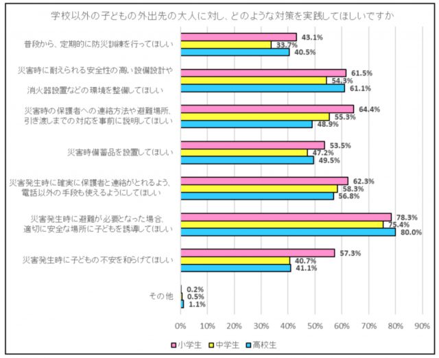 塾や習い事、学童保育等子供が学校外で過ごす場所の大人に、災害時に備えてどのようなことを実践してほしいかも調査している(複数回答方式)。約8割の保護者が、「災害発生時に避難が必要となった場合、適切に安全な場所に子どもを誘導してほしい」と回答している。