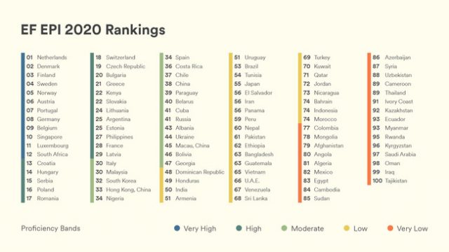 EF EPI 英語能力指数2020 年版のランキングは以下のサイトで確認できる。