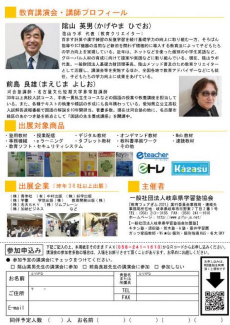 毎年著名なゲストを招いて行われる教育講演では、陰山ラボ代表の隂山英男氏と、河合塾講師で名古屋文化短期大学非常勤講師の前島良雄氏がそれぞれ講演する。同フェアの事務局によると、「コロナ禍でより一層子どものやる気を引き出すことは重要になっています。陰山先生には、『子どものやる気を引き出す方法』をテーマに、前島先生には共通テストの実施とコロナ禍の影響で入試がどのように変わるのかについてお話しいただきます」という。