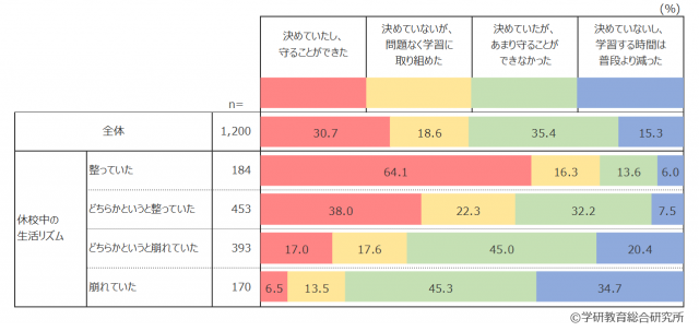 「休校中の生活リズム」が整っていたかどうかと、「休校中の学習管理」ができていたかどうかには、生活リズムが整っているほど自分自身の学習管理ができていたという相関がみられることがわかった。