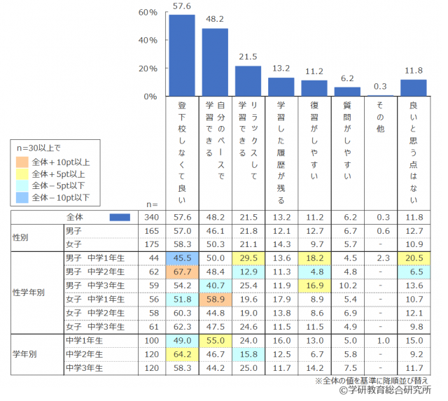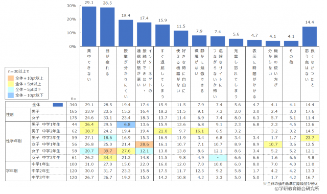 オンライン学習に取り組んでみて、「良い・悪い」と感じた点を尋ねたところ、「良い点」は「登下校(※塾含む)しなくて良い」(57.6%)、「自分のペースで学習できる」(48.2%)とつづき、一方「悪い点」は「集中できない」(29.1%)、「目が疲れる」(28.5%)が目立つ結果となった。