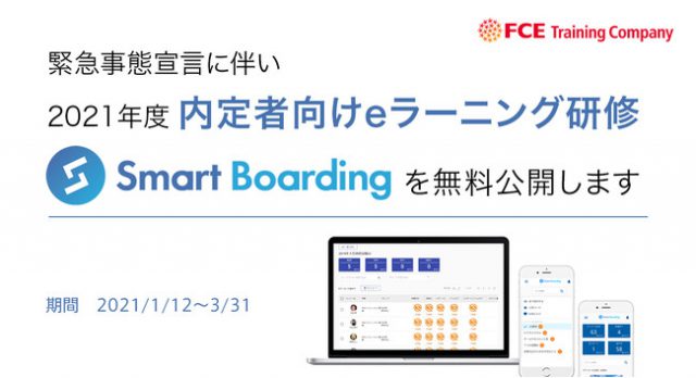 人材育成事業を行う株式会社FCEトレーニング・カンパニー(東京・新宿区、荻野 純子 代表取締役)は、2021年1月7日(木)に発令された緊急事態宣言に伴い、年度の新入社員・内定者向け研修実施に関する相談が急増している状況を受け、eラーニングシステム「Smart Boarding」の内定者向け学習コースを無料公開する。