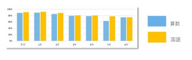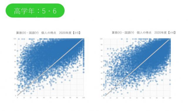 幼児・低学年のうちはあまり差がでないが、中学年になると、国語・算数共に得点の分布が開き始める。高学年になるとよりその差が顕著になる。国語の点数が最低限取れない児童は、算数の得点が伸びない傾向がみられることがわかった。テストの内容から、国語の点数が低く算数の点数も低い児童は、算数の文章題が理解できていないために得点出来ていないと考えられる。