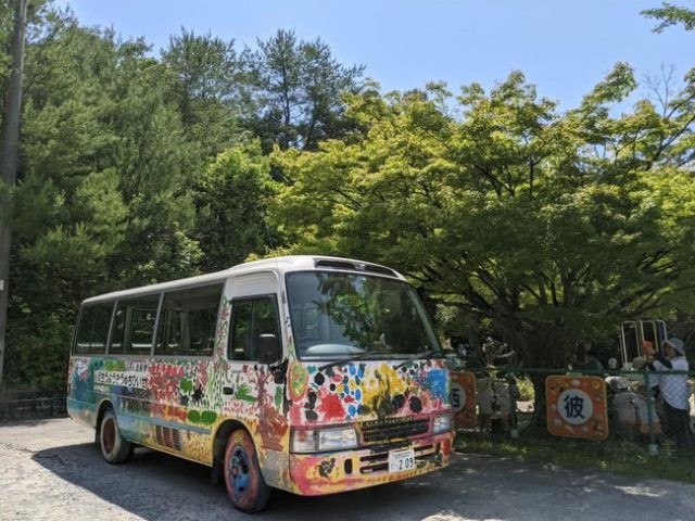 日本ペイントの水性塗料で彩られたベニヤ板は、来園者を迎え入れる幼稚園看板として飾られ、送迎用バスは、児童たちの楽しい夢や希望を発信しながら、6月3日から、西彼町を走っている。