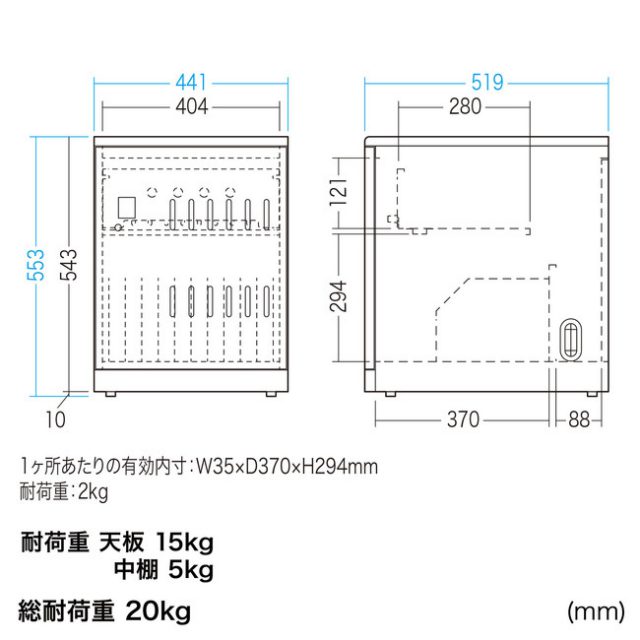 重量は21.3kg、耐荷重は20kg。本体サイズは幅441×奥行き519×高さ553mmとコンパクトタイプのため、設置する場所を選ばない。保管中に充電もできるため、教室やオフィスでの共有パソコン・タブレット保管庫としておすすめだ。