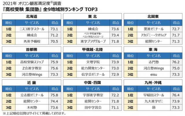 株式会社oricon ME(東京都港区 代表取締役社長:小池恒)は、『高校受験 集団塾/個別指導塾』についての満足度調査を実施し、2021年11月1日(月)14時00分にその結果を「オリコン顧客満足度®」公式サイト内(https://life.oricon.co.jp/)にて発表した。この調査は、高校受験を対象とする塾に通年通学している(したことのある)現役中学生/高校生を持つ保護者を対象に、『集団塾』『個別指導塾』それぞれの満足度について、インターネット調査を行なった。『高校受験 集団塾』、『高校受験 個別指導塾』各ランキングともに、公式サイト内では全9地域ごとの総合評価のほかに、評価項目別、都道府県別ランキングを公開している。