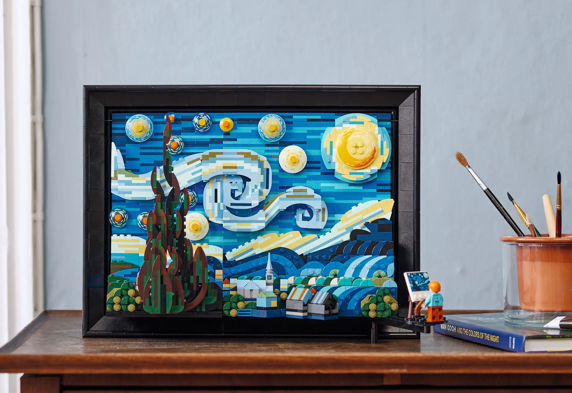 ゴッホが1889年に描いた名画「星月夜」をレゴ® ブロックで三次元に再現しており、ゴッホの印象的な筆致と色遣いに強くこだわっている。また、ゴッホのミニフィギュアには、絵筆、パレット、イーゼル、そしてタイルに描かれたミニペインティングが付属しており、アームに装着することでゴッホが絵を描いている様子を表現することも可能。この複雑なセットは、立てて飾ることも、吊り下げ機能を用いて壁に飾ることもできる。