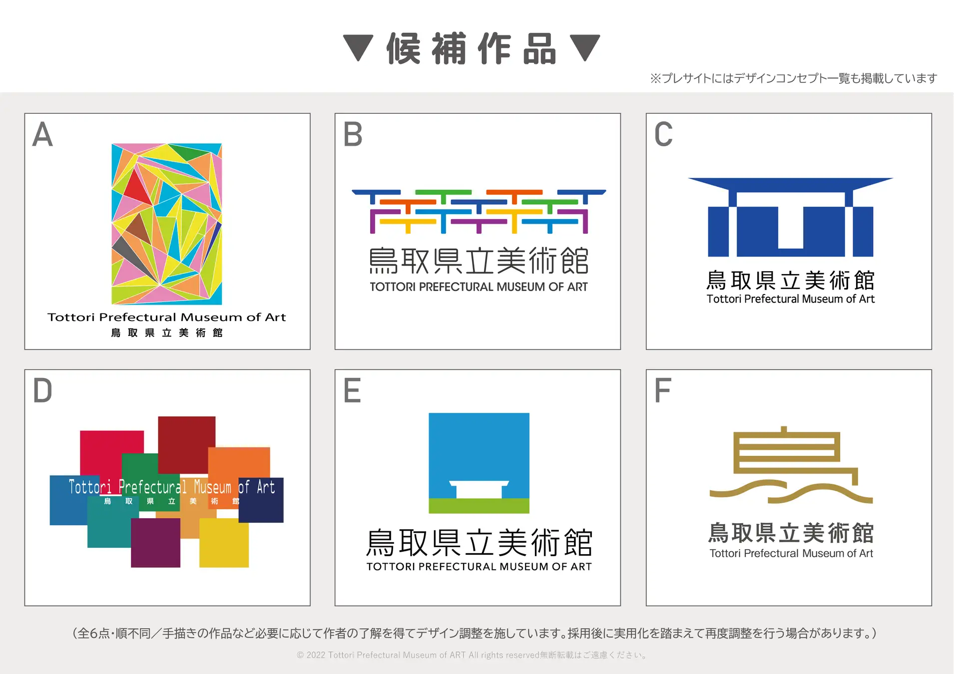 2025年春の開館を目指し建設中の鳥取県立美術館について、ロゴ・シンボルマークの一般投票を9月1日~30日の間、実施する。投票には、LINEアプリのリサーチ機能を使用し、LINEアカウントをお持ちの方なら誰でも、国内外どこからでも投票可能。候補作品は応募された1,726点の中から一次審査を通過した6点で、プレサイトにはそれぞれのデザインコンセプトも掲載している。