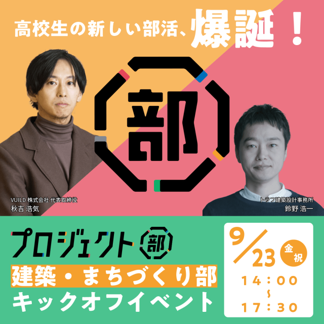 最前線で活躍する建築家2名を招待し、高校生とともにこれからの《建築・まちづくり》について考える、オンライン・イベントを9月23日(金・祝)に開催する。時代と共に変化するものづくりへのアプローチやプロジェクトの切り拓き方について、 今まさに新分野を開拓中のプロフェッショナルと共に語り、想像しよう!