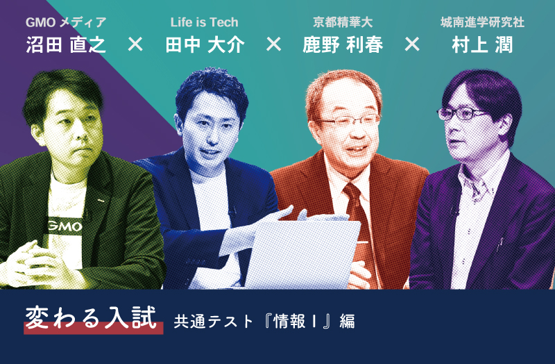 第3部は「変わる入試」と題し、共通テスト「情報I」について議論を交わしてもらいました。登壇したのはLife is Tech 学習塾事業推進室 室長 田中 大介氏、京都精華大学 メディア表現学部 教授 鹿野 利春氏、城南進学研究社 教育ソリューション事業本部 部長 村上 潤氏、GMOメディア コエテコ事業責任者 沼田 直之氏の4名。話題となっている共通テスト「情報I」について、各立場から様々な意見が寄せられました。