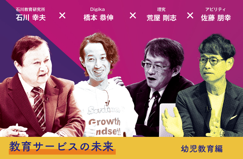 2日目の第3部は「教育サービスの未来」と題し、幼児教育について議論を交わしてもらいました。登壇したのは石川教育研究所の石川 幸夫 氏、Digika 橋本 恭伸 氏、理究 荒屋 剛志 氏、アビリティ 佐藤 朋幸 氏の4名。各立場から様々な意見が寄せられました。
