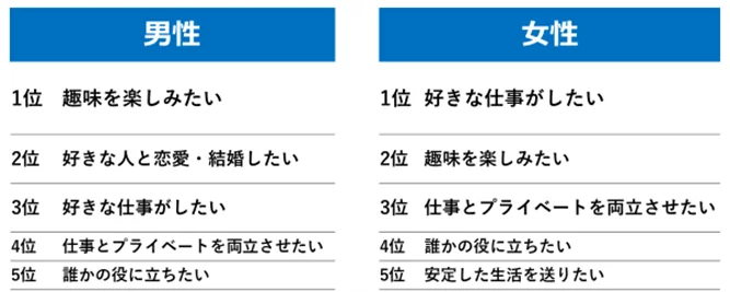 ・男女ともに「趣味を楽しみたい」「好きな仕事がしたい」が上位。男子は趣味や恋愛・結婚、女子は仕事に関するものがより上位となっている。