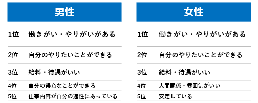 ・男女ともに「働きがい・やりがいがある」「自分のやりたいことができる」「給料・待遇がいい」が上位。