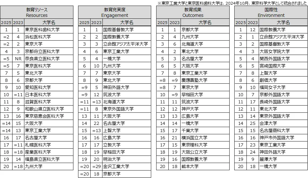 分野別ランキングでは、「教育リソース」で東京医科歯科大学が、「教育充実度」では国際基督教大学が、「教育成果」では京都大学が、再び1位となった。「国際性」では前回の12位から大きく順位を上げて国際教養大学が1位となり、総合ランキングトップ10入りの要因となった。