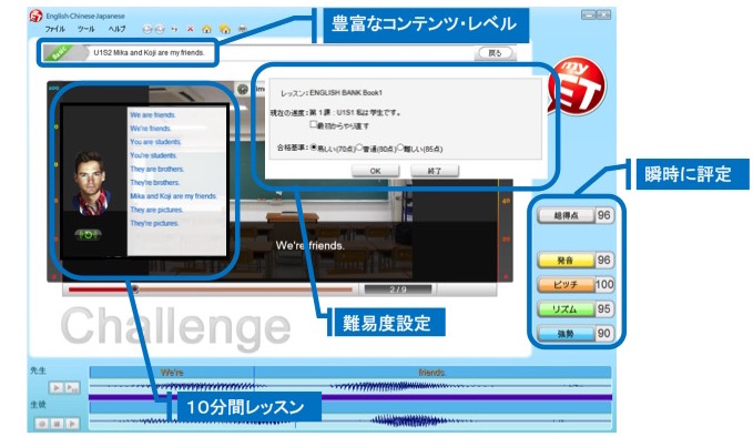 日本語は音節が多い言葉であり、カタカナ発音で英語のリズムが出ないのだがMyETは「発音」だけでなく、「ピッチ」と「リズム」にもフォーカスし、日本人にピッタリのトレーニングシステムになっている。