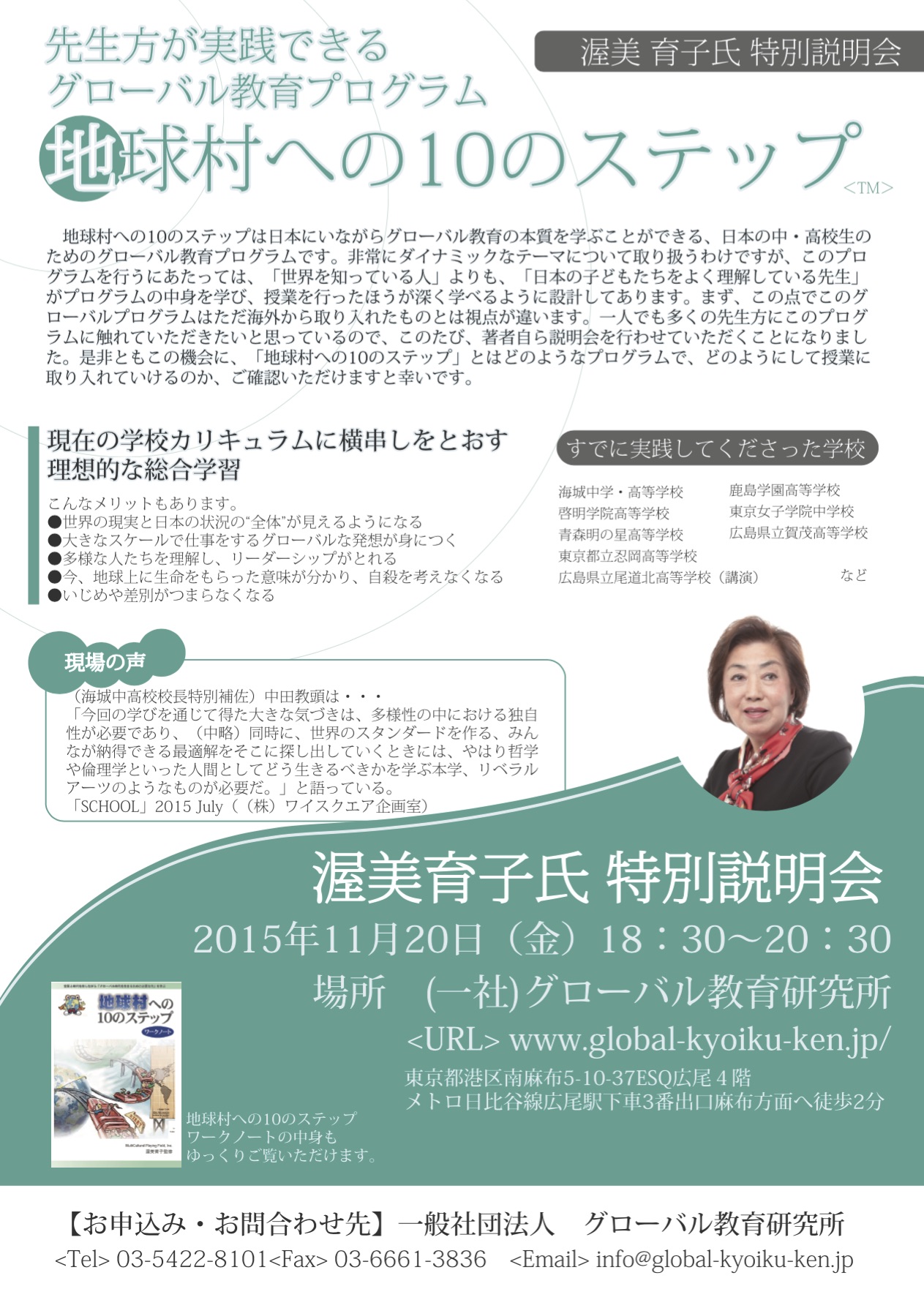 一般社団法人グローバル教育研究所(東京・港区、渥美育子理事長)は、グローバル教育を中学校や高等学校で実践できるプログラム「地球村への10のステップ」の導入事例や、具体的な活用法に関する特別説明会を、学校の校長・副校長・教頭を対象に11月20日、東京・広尾にある同研究所の日本本部で開催する。