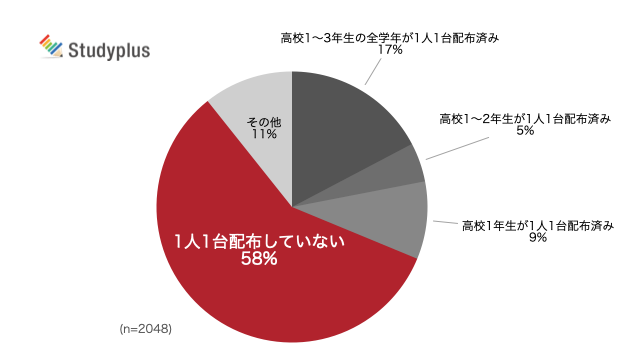 学習記録SNS「Studyplus」を運営するスタディプラス株式会社(東京・千代田区、廣瀬 高志 代表取締役)は、2021年4月23日〜5月7日の間に全国の高等学校の教科主任を対象として「1人1台端末」整備状況やデジタル教材の導入状況に関するアンケート調査を行い、2,048件の有効回答を得た。
