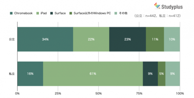 公立高校ではChromebookやSurface等のWindows端末が多い一方、私立ではiPadが多くの割合を占めており、ここでも公立・私立で傾向が異なっている。