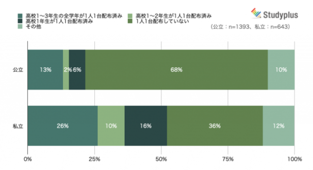 公立高校に限ると約7割が「1人1台配布していない」との回答で、多くの公立高校ではまだ配布も開始していない状況だ。一方、私立高校では「1人1台配布していない」との回答は36%であり、公立と私立の間で1人1台端末の整備状況に明らかな差があった。