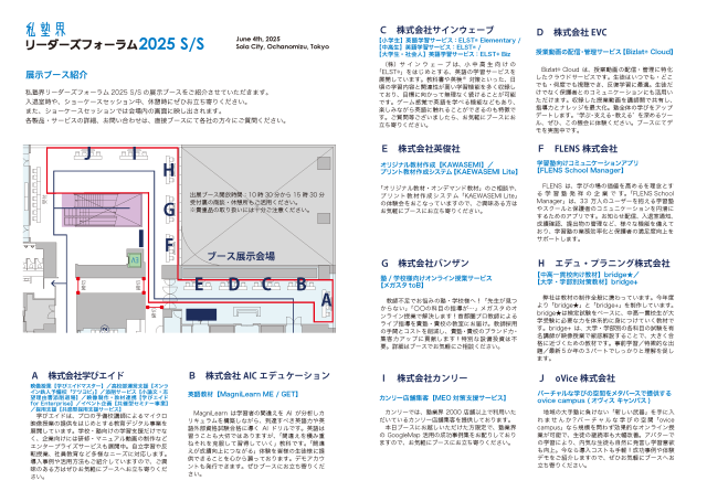 新しい教材や教育プログラム、テクノロジーを活用した新しい学習方法など、多数の出展企業が参加予定です。 このセッションでは、最新の教育情報を一堂に集め、情報交換の機会を提供します。