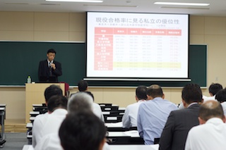 この日講演者として招かれたのは、緻密なデータ分析に基づき、関西圏の中学受験トレンドに詳しい株式会社エデュケーショナルネットワークの藤川享氏と、大胆な学校改革で同大付属平安中学校の入学者数を3年で約3.5倍に押し上げ、合理的な進学校化で大学合格実績向上をマネージメントする校長補佐の平井正朗氏。