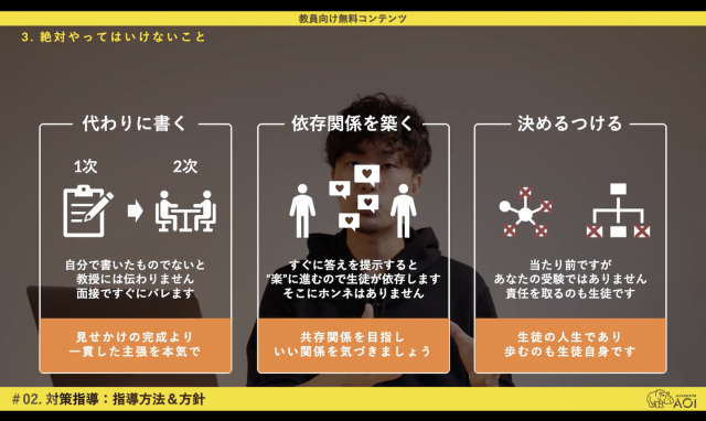 「AOI for Teachers」は、生徒ではなく、先生のためのツール。コンテンツは、10本の動画教材で構成され、総合型選抜の基礎知識と小論文、プレゼンテーションなどの指導・対策が学べる(2021年7月現在)。また、会員制のチャットサービスを設けることで、受験情報の共有、他校の先生との意見の交換や指導課題へのアドバイスなどを受けられるようにした。